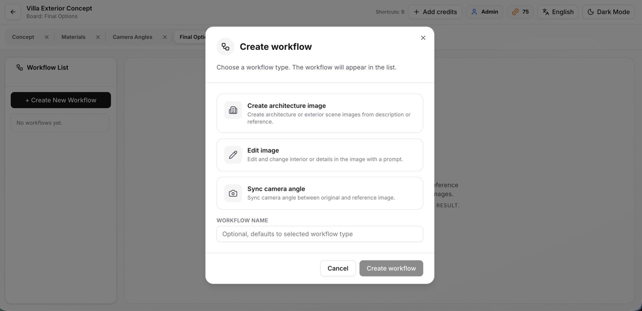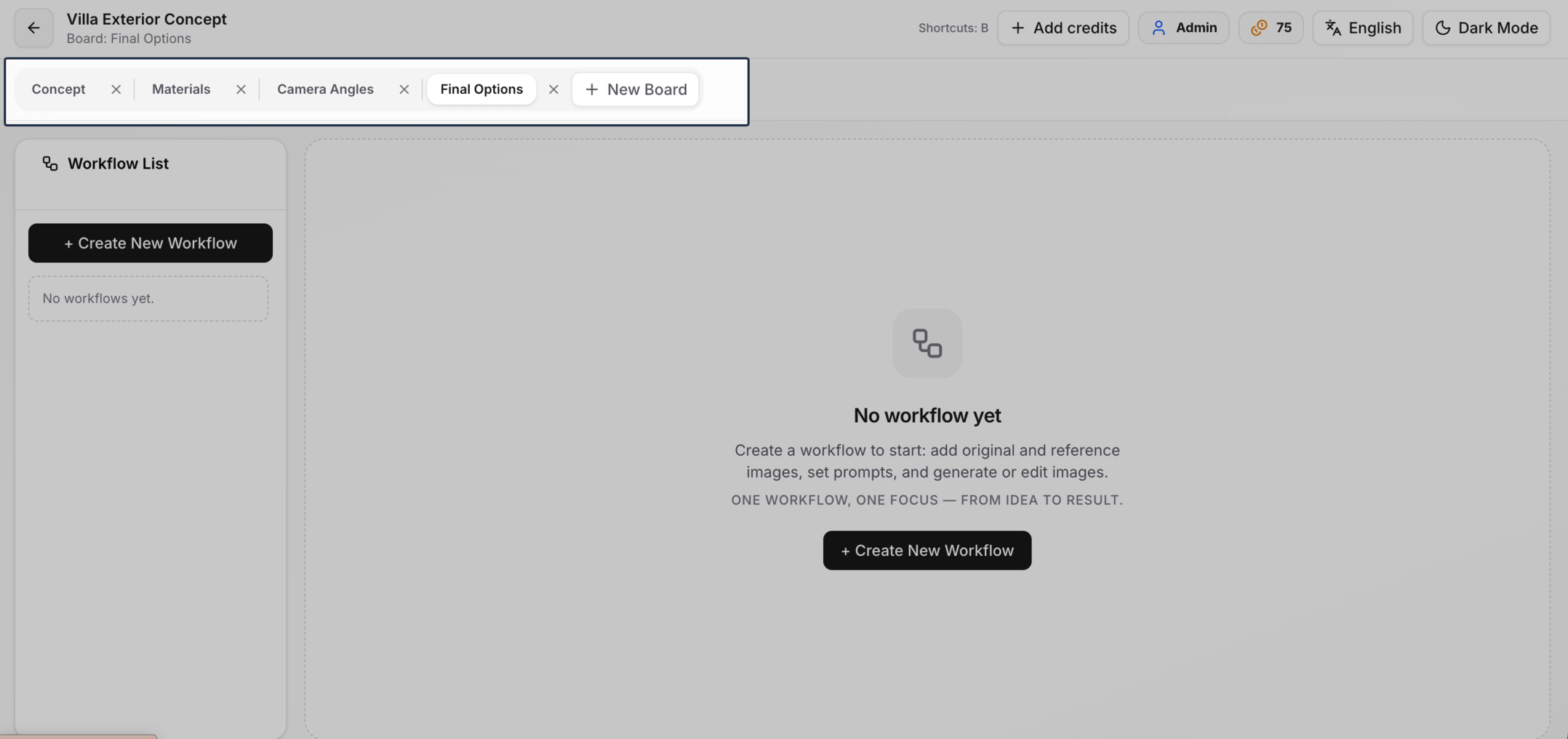 Inside each board, run the right workflows (generate, edit, camera sync, refine) to create and iterate options.
