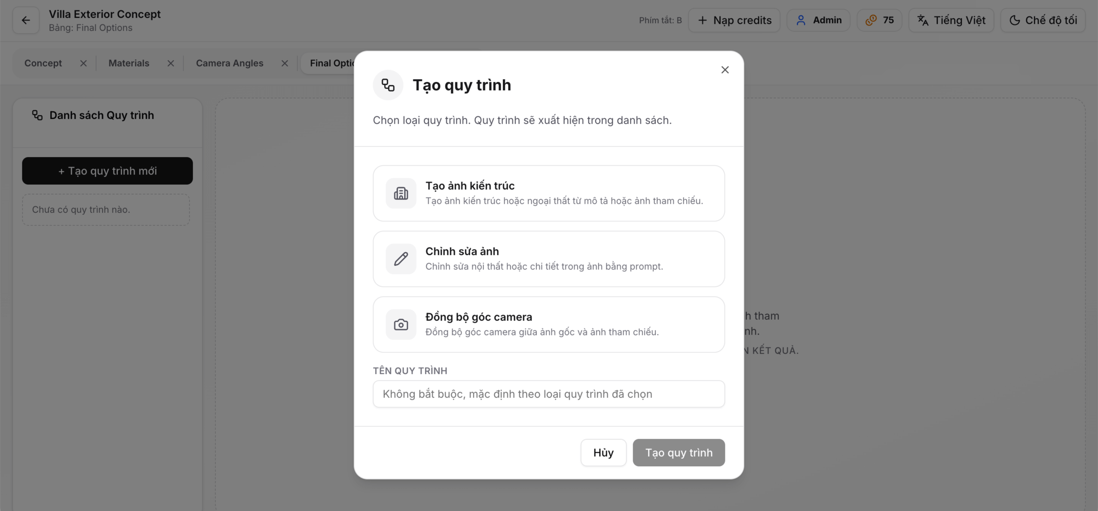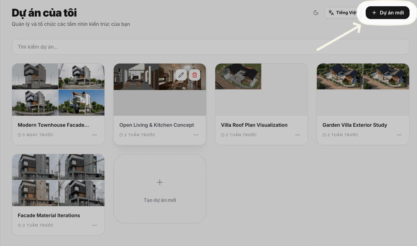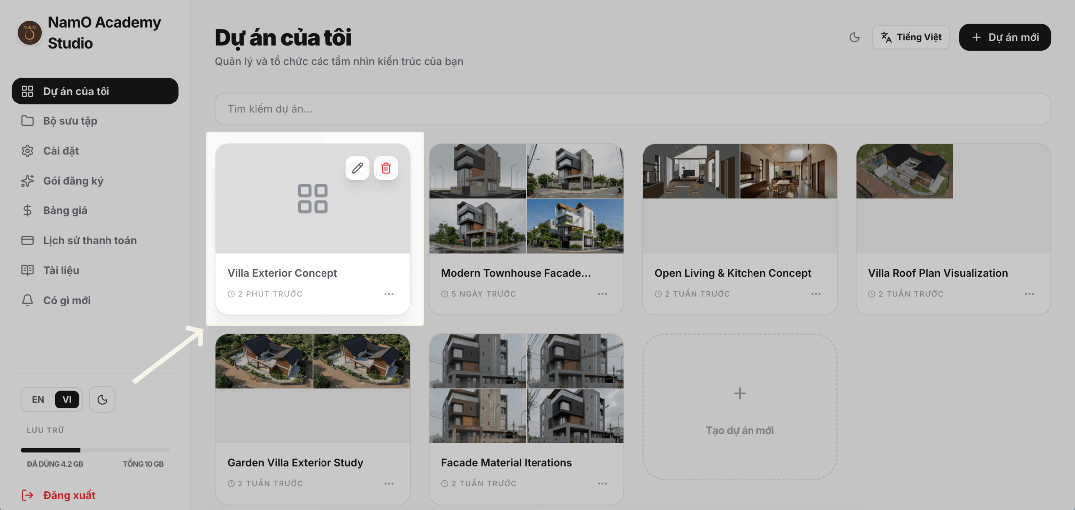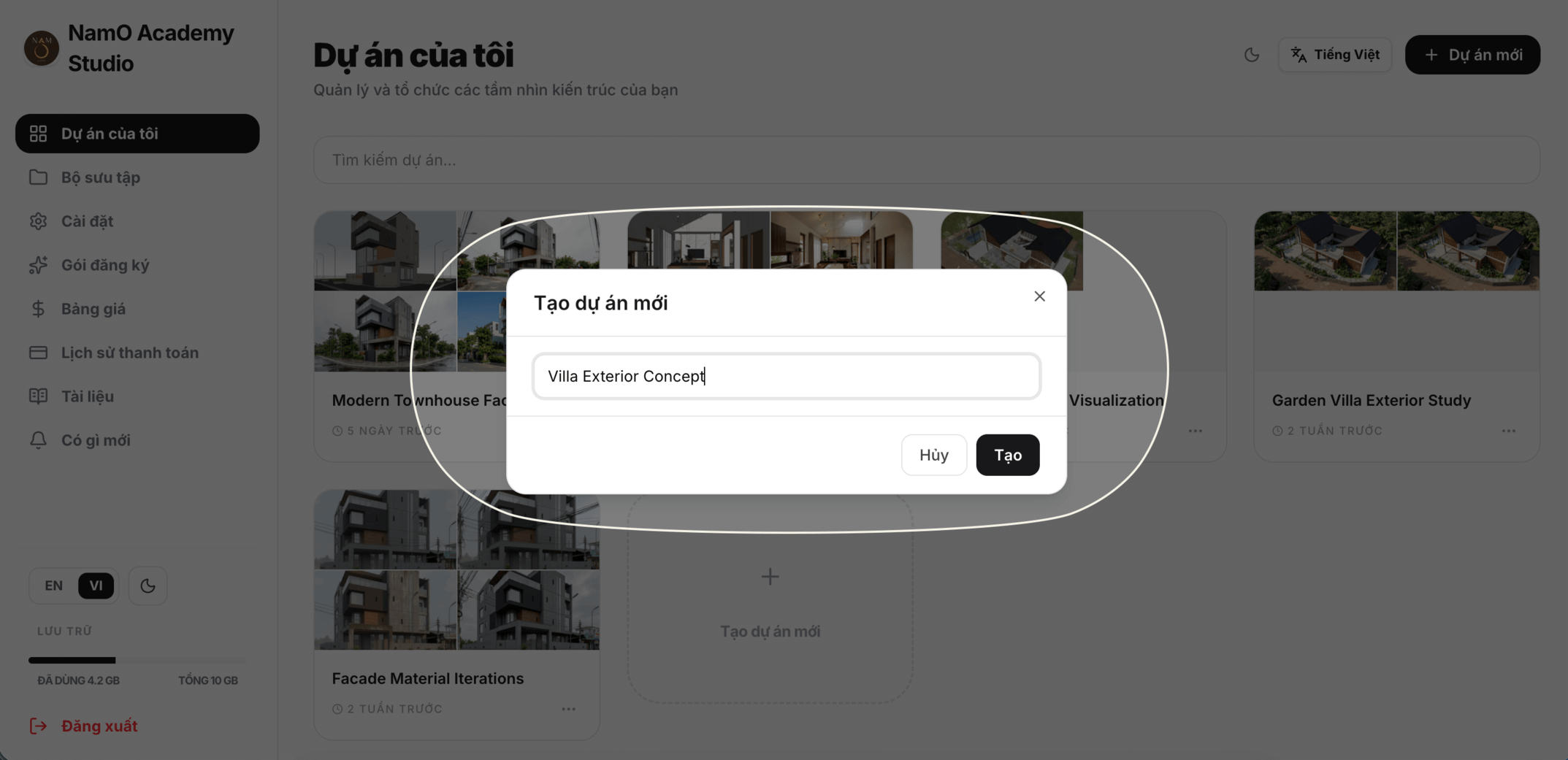 NamO Academy Studio là nền tảng bảng và quy trình làm việc hỗ trợ AI cho trực quan hóa kiến trúc. Tài liệu này giải thích cách dự án, bảng, đầu vào, gợi ý, quy trình và mô hình AI hoạt động cùng nhau để giúp bạn đi từ phác thảo hoặc tham chiếu đến hình ảnh sẵn sàng trình bày một cách nhanh hơn và có thể lặp lại.