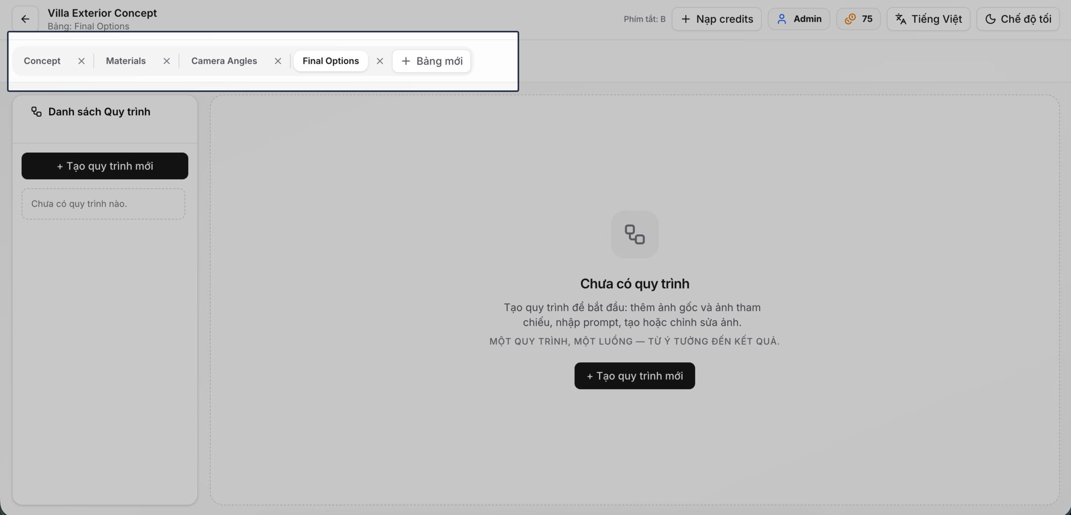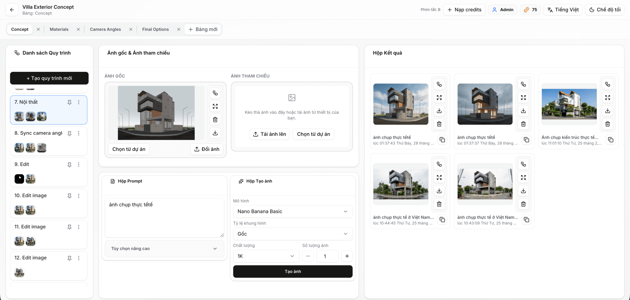 Trong từng board, chạy các workflow phù hợp (generate, edit, camera sync, refine…) để tạo và lặp phương án.