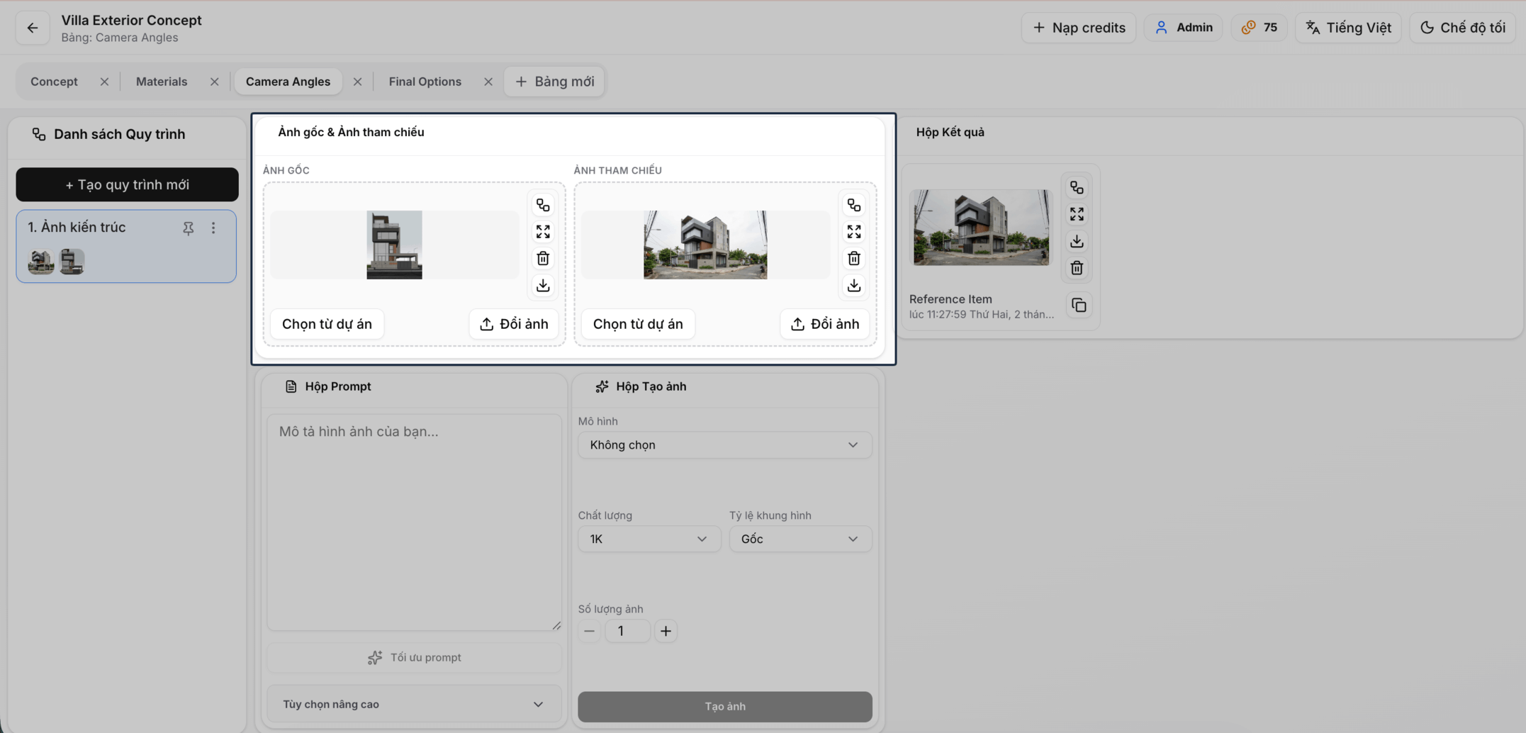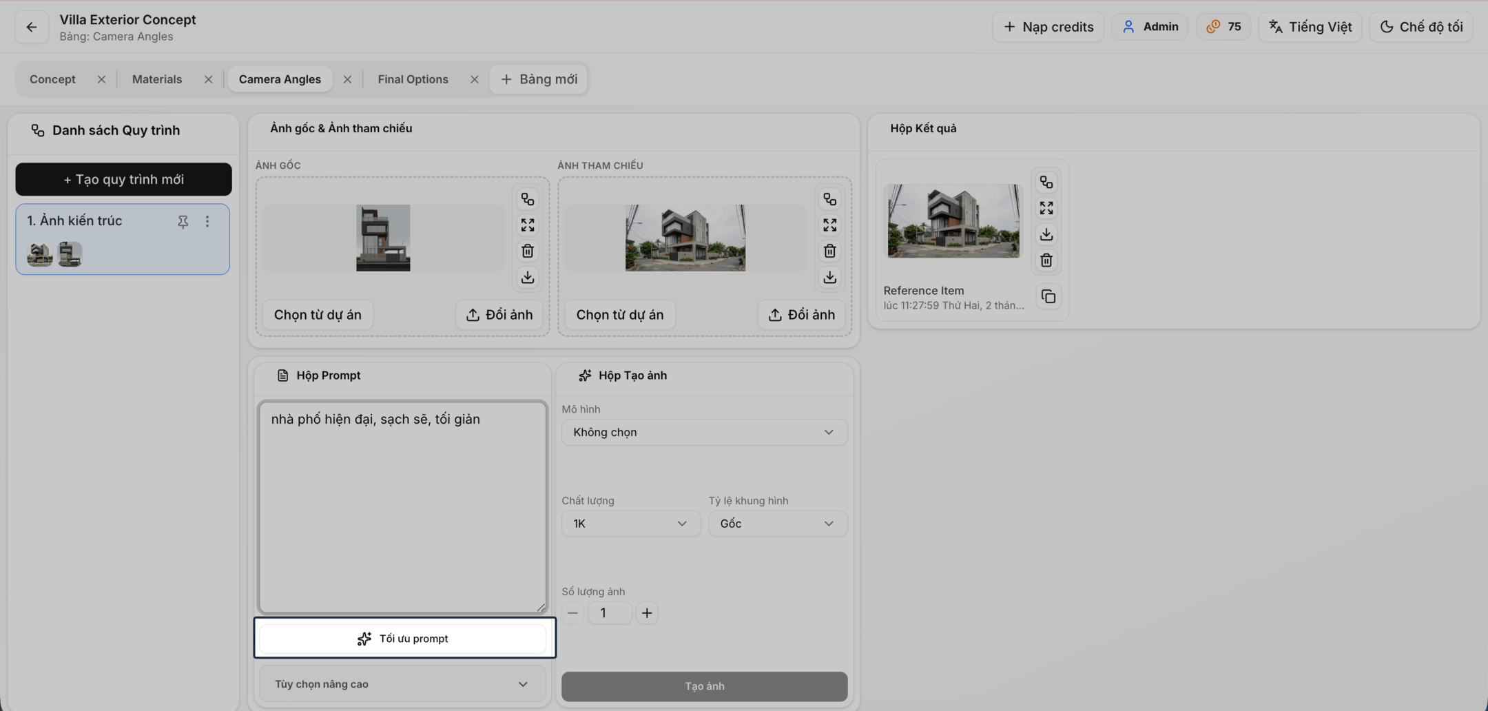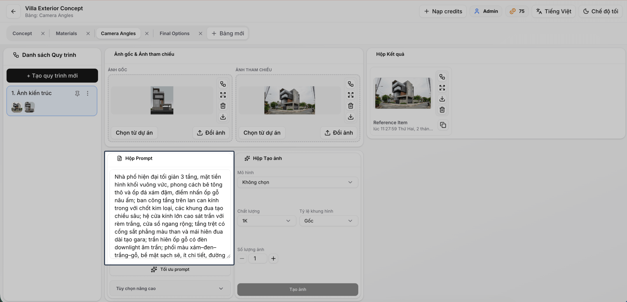 (Có ảnh tham chiếu) Nhập một prompt ngắn mô tả mục tiêu (ví dụ: “nhà phố hiện đại, sạch sẽ, tối giản”).